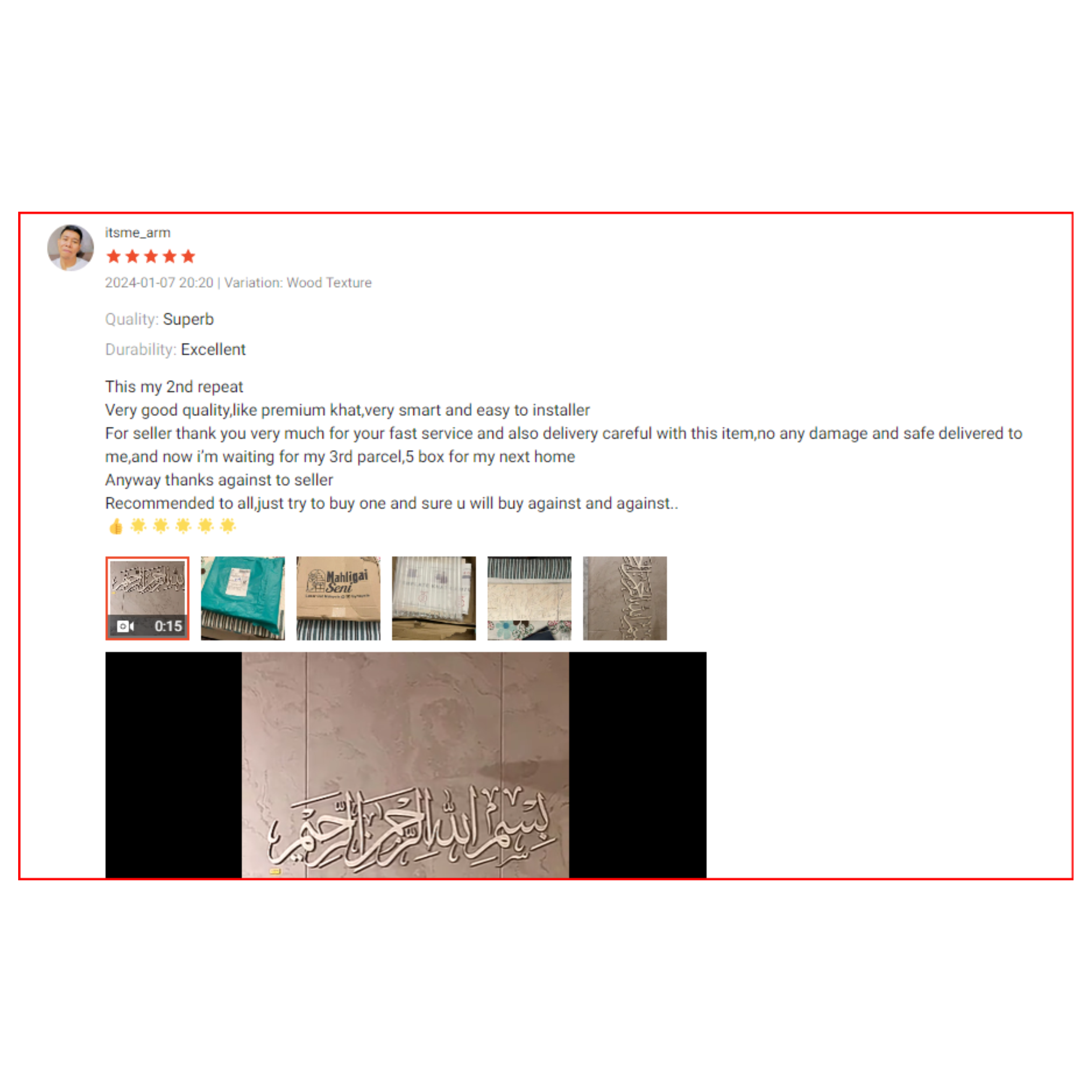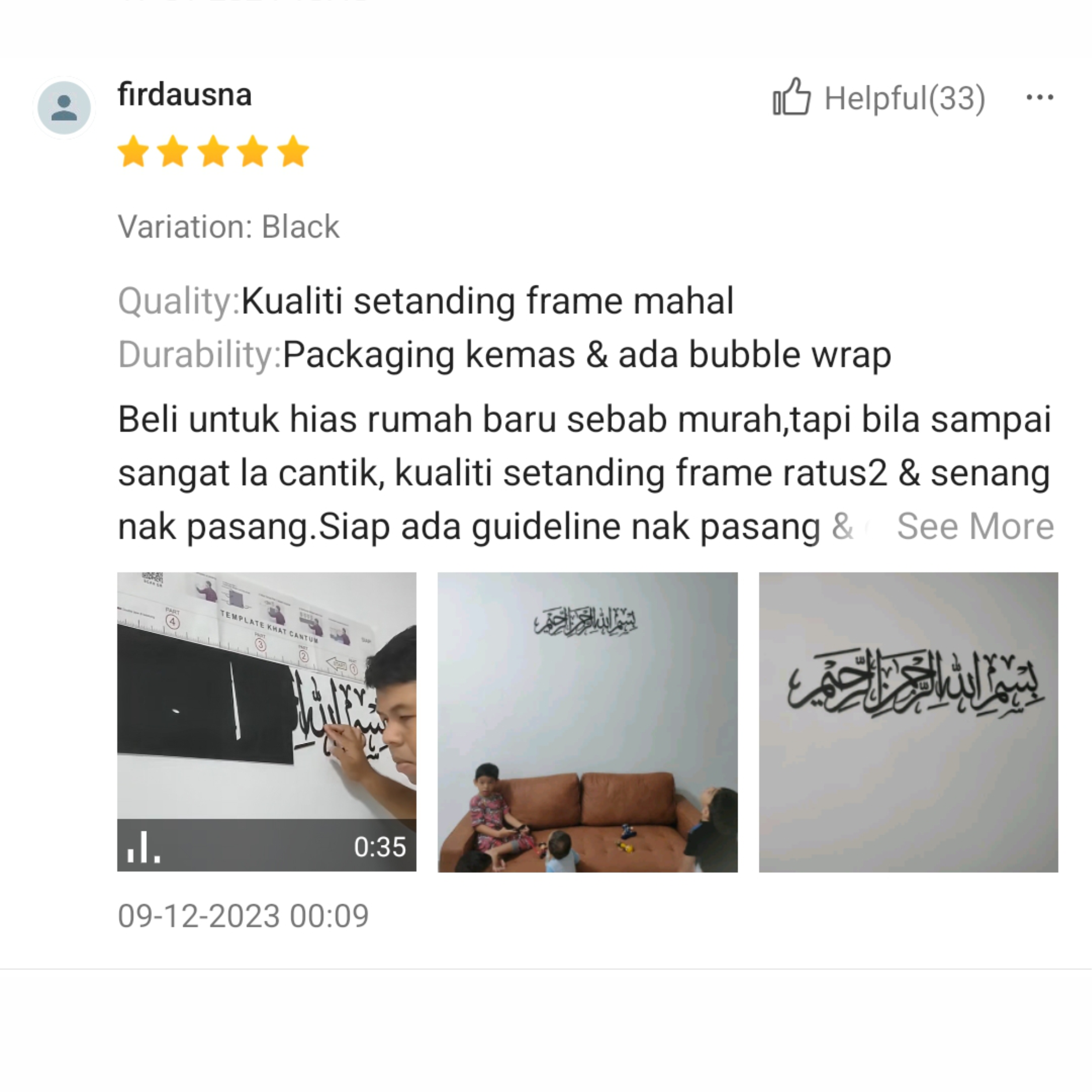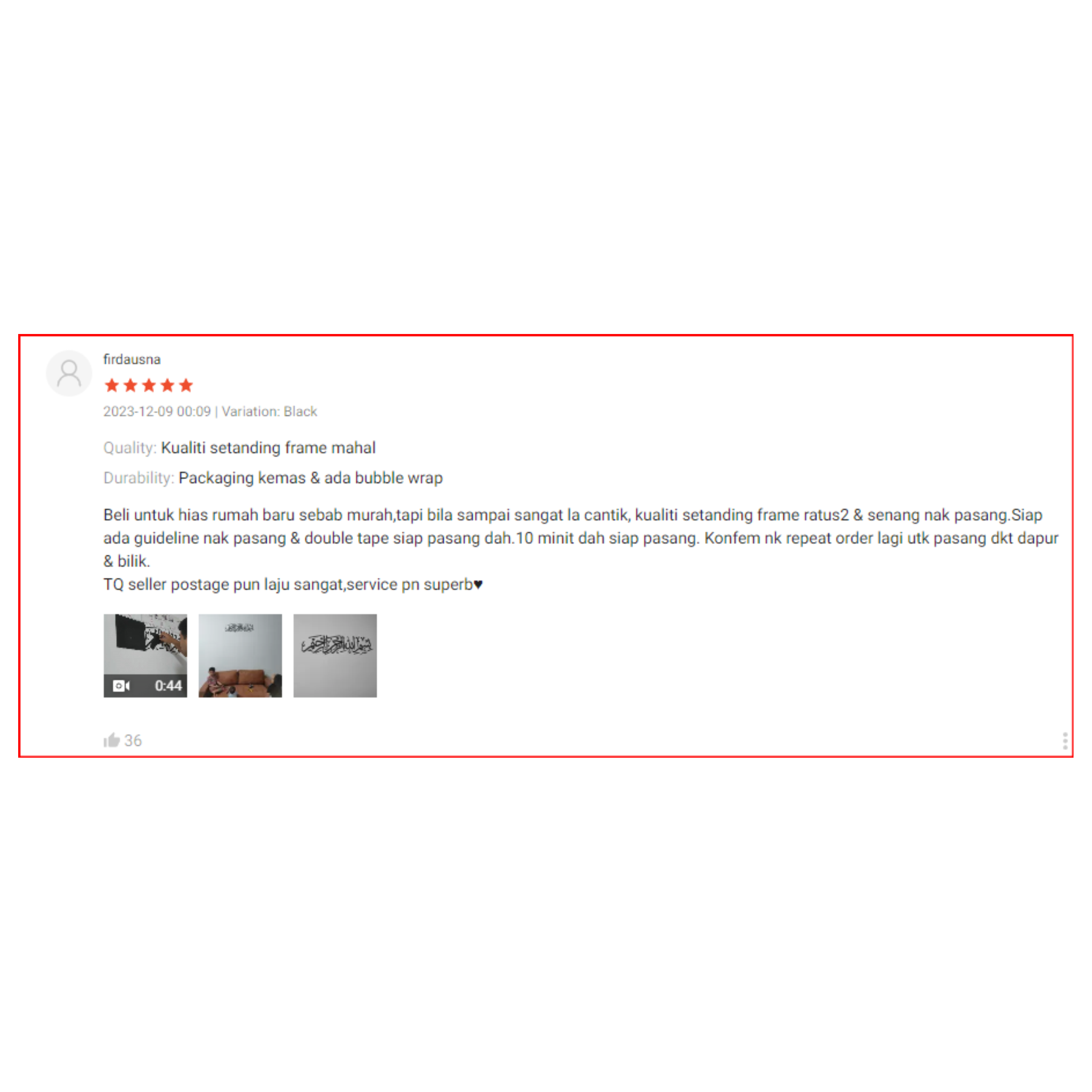 2. Sangat la cantik, kualiti setanding frame ratus2 & senang nak pasang.Siap ada guideline nak pasang & double tape siap pasang dah.10 minit dah siap pasang. Konfem nk repeat order lagi utk pasang dkt dapur & bilik.'
